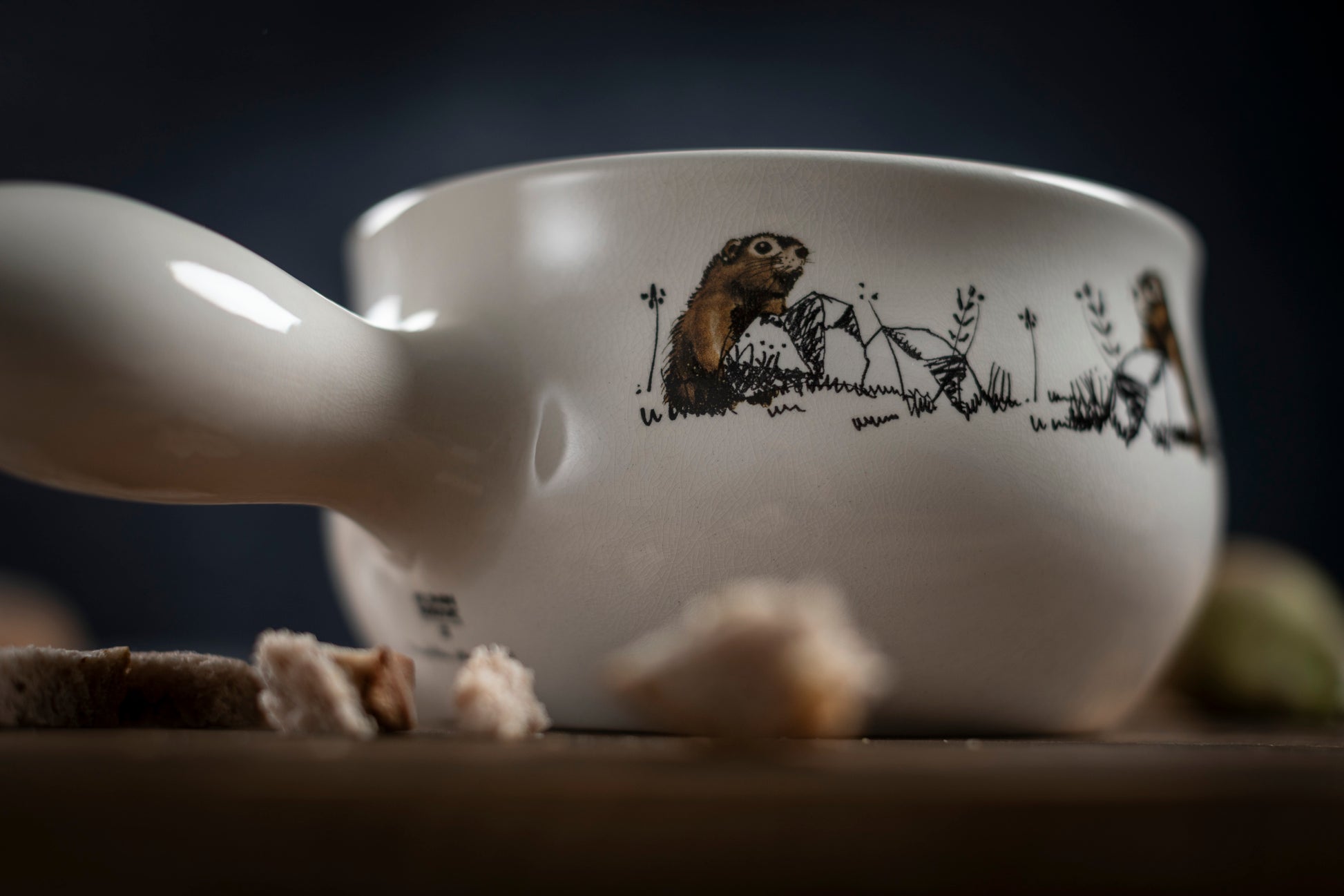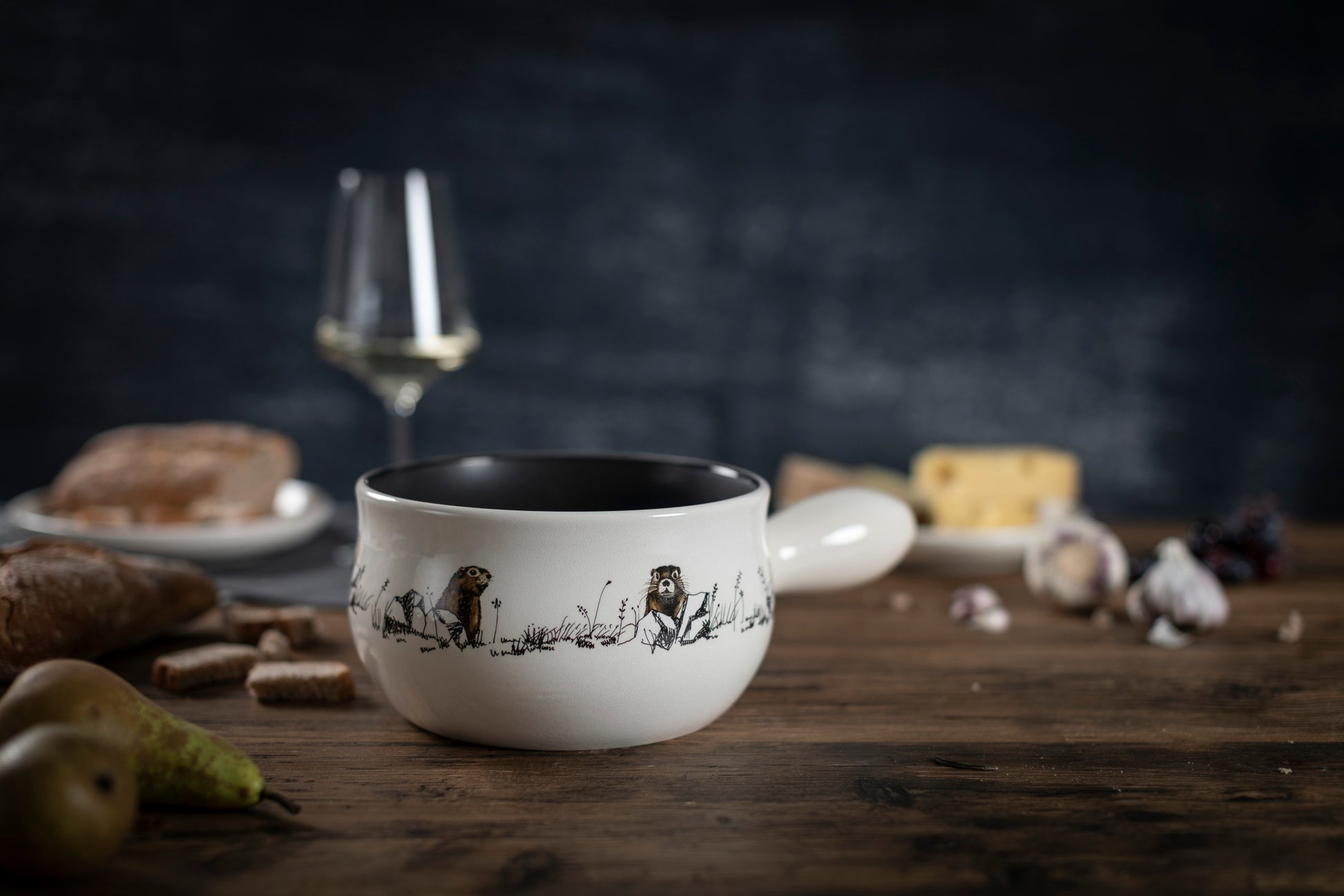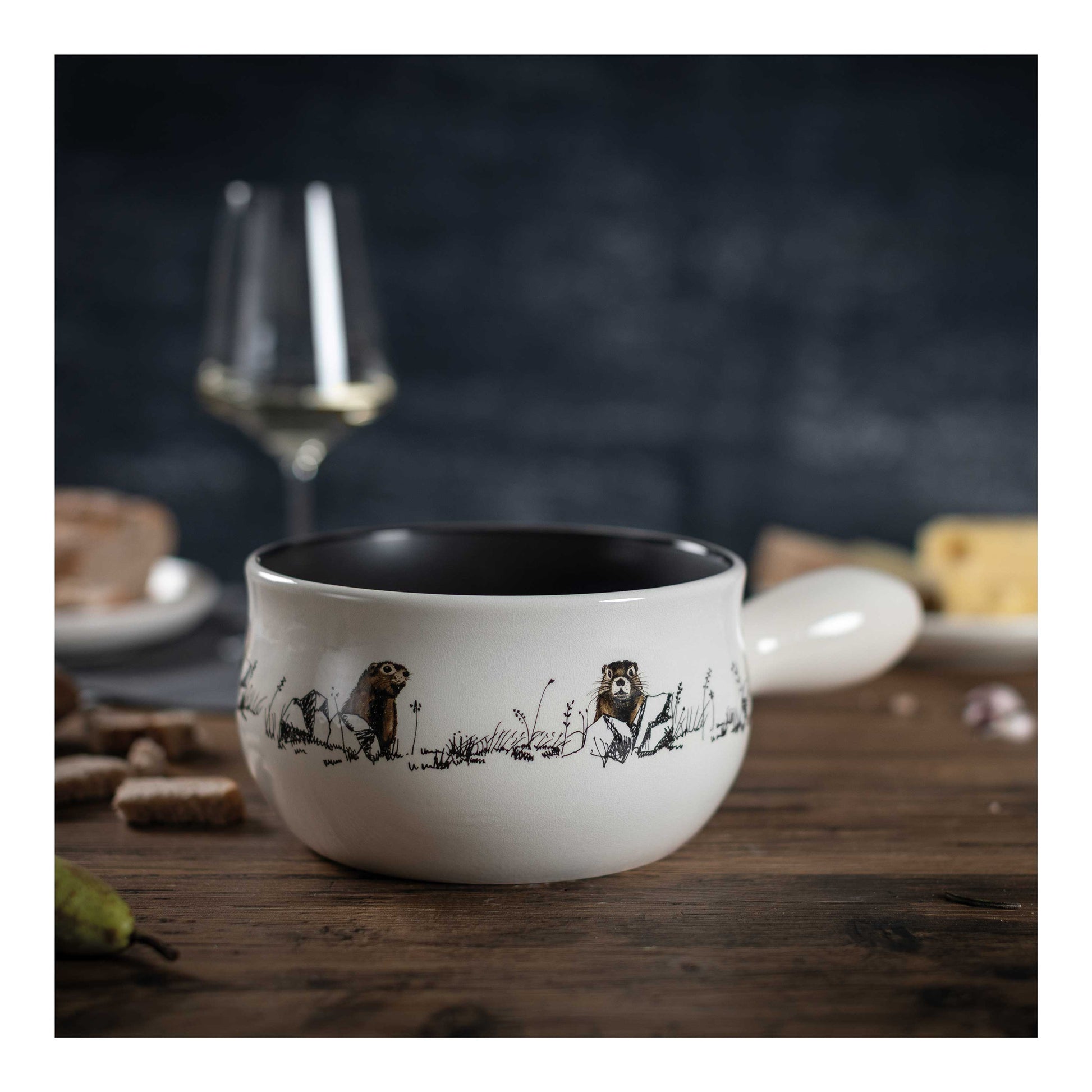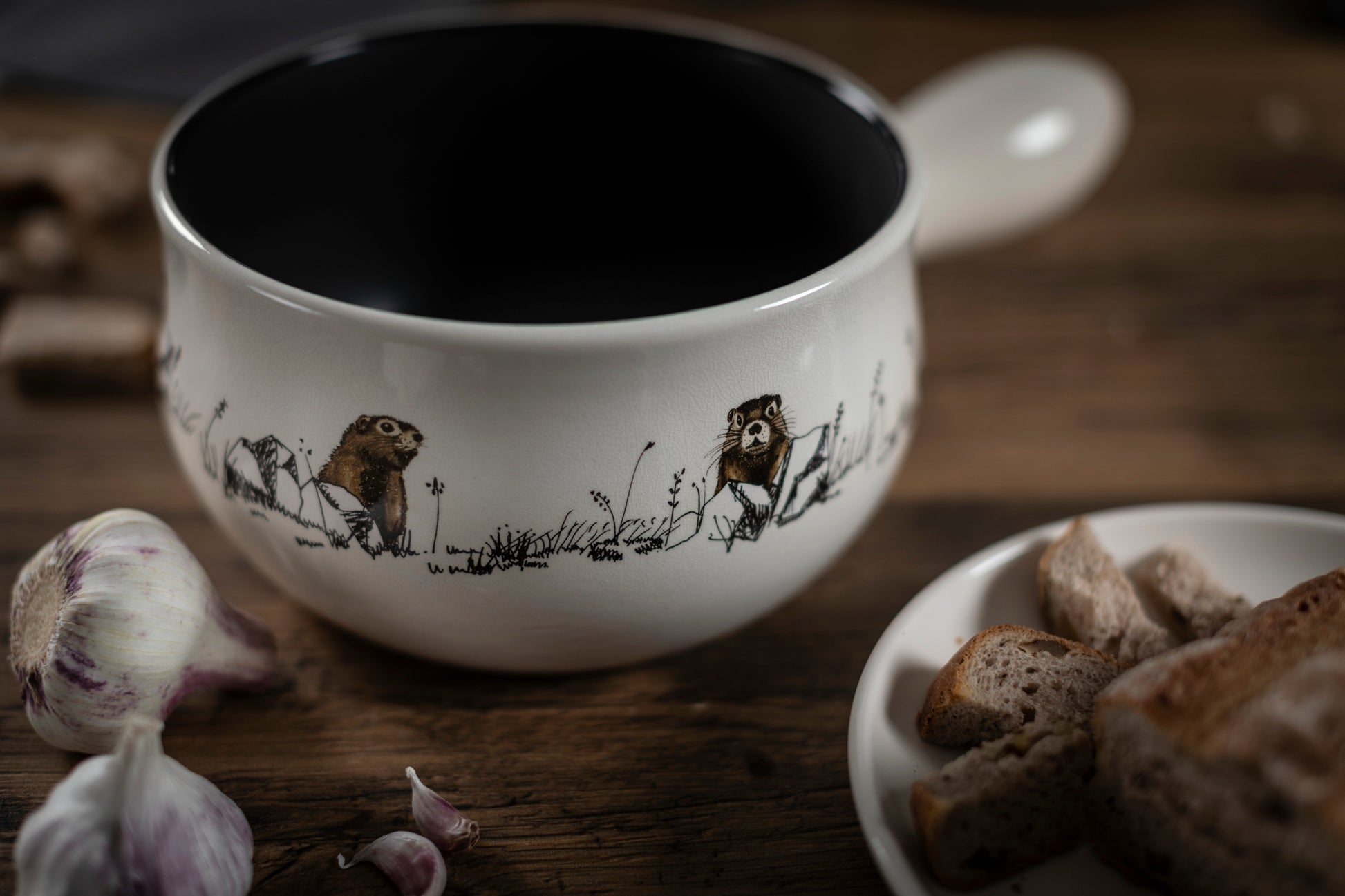 Kleine Haarrisse in der Glasur ermöglichen eine hohe Temperaturwechselbeständigkeit. Bei hellen Glasuren können diese Risse nach mehrmaligem Gebrauch vermehrt sichtbar werden. Bitte klopfen Sie beim Fonduekochen nicht an den Rand des Caquelons. Achten Sie auch darauf, während des Essens nicht am Rand der Gabel zu klopfen, da dies zu Beschädigungen der Glasur oder des Tons führen kann.